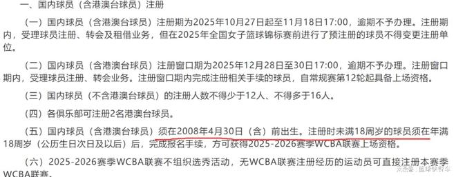不过,遗憾的是,从篮协这一次新赛季规定来看,他们并没有更改的意思,WCBA新赛季依旧要达到年满18岁,才可以登场比赛。即2008年4月30日以前出生的球员,才允许被注册成功。而2008年5月份以后出生的球员,他们则无法被注册。另外,即便是2008年4月30日以前出生的球员,他们想要登场比赛,也需等到年满18岁,才可以正式注册成功。