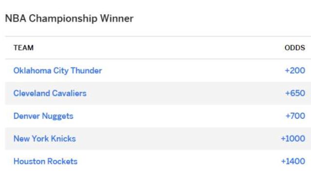 ESPN的冠军赔率:雷霆 +200,断层第一;