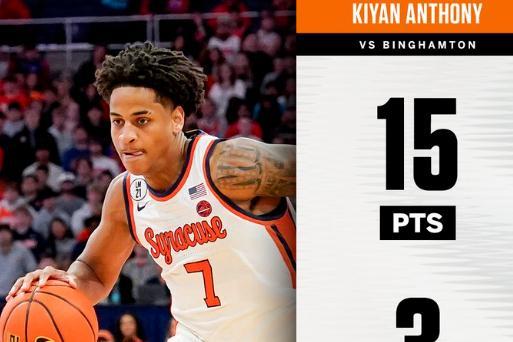 看这个名字大家应该很熟悉吧,没错,他就是卡梅隆·安东尼的大儿子。而他加入的大学,也是追随了父亲的脚步。NCAA的首场比赛,基杨·安东尼替补出战,最终以60%的命中率得到了15分3篮板3助攻的数据,最终,也帮助雪城大学85-47大胜宾厄姆顿大学。这个数据,在NCAA中已经算很可以了,毕竟是首场比赛,更是替补出战。要知道,状元热门皮特森首秀出战22分钟,得到了21分;而另一状元大热AJ·迪班萨,同样拿到了21分。而且和这些身为五星高中生的状元大热不同的是,基杨·安东尼只是被评为四星高中生,在媒体眼中,称不上最顶级的潜力新秀。