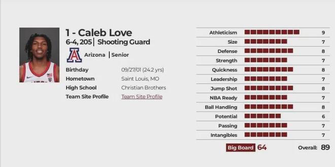 受口罩特殊政策影响,乐福在亚利桑那大学又打了两年,但依然未能打出统治级的亮眼表现,今年他以大五毕业生身份自动参加选秀,因为他是从高中就备受瞩目又打了五年大学的高龄秀,球探对他的能力可以说是了如指掌,所以他的选秀报告非常精准,我放上NBA DRAFT网站的选秀报告,综合评分89分(在尺寸、强壮度、领导力、NBA准备、潜力、传球、无形资产方面都评分较低),预计选秀顺位落选,选秀模板拉沙德-麦坎茨(2005年首轮14顺位秀)。