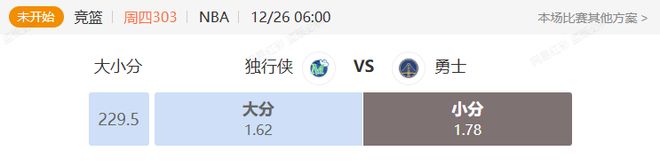 在一分险胜掘金之后,独行侠本场的对手,是金州勇士,勇士上一场比赛以23分大胜魔术,近期取得了两连胜,此番对阵独行侠,两队上赛季互有胜负,本赛季,库里再度与老伙计克莱对阵,结合两队上一场状态都不错的情况,胜负并不好说,但在比分方面,值得留意的是,本场独行侠多名悍将,如华盛顿,汤普森,克里斯蒂均因伤出战成疑,这使得球队的外线火力有了不小的下滑,而勇士一方,球队上一场打出了很高效的防守能力,不过近期整体得分也不算很高。结合独行侠整体外线投射平平的特质,或许,小比分,是本场最合适的选择。