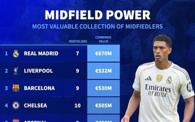 各队中场球员总身价排行:皇马6.7亿欧居首利物浦第二、巴萨第三