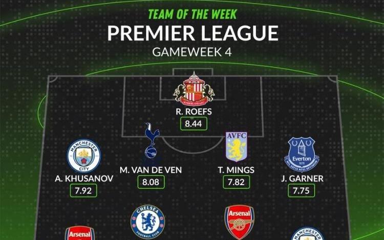 WhoScored英超第4轮最佳阵:阿森纳曼城各3人,凯塞多范德文在列