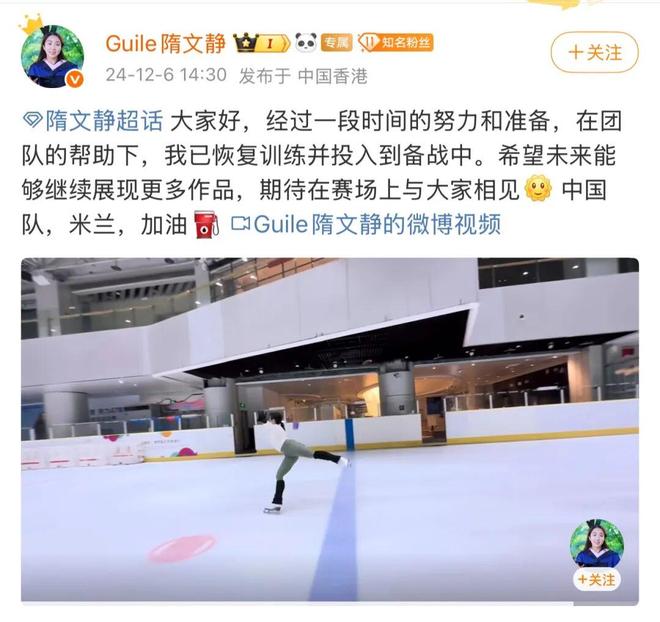 2024年12月,隋文静率先通过微博发声“经过一段时间的努力和准备,已恢复训练投入备战,中国队,米兰,加油”,正式宣告回归,视频中她跳跃稳健、滑行流畅,状态极佳。复出初期,隋文静曾与多位男选手搭档训练,磨合技术衔接。