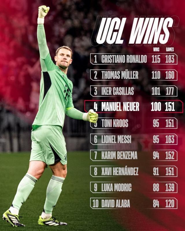 直播吧9月19日宣 拜仁在昨晚的欧冠焦点战3-1力克切尔西,诺伊尔成为历史第4位欧冠100胜球员。拜仁官方也列出了欧冠历史胜场榜纪录。