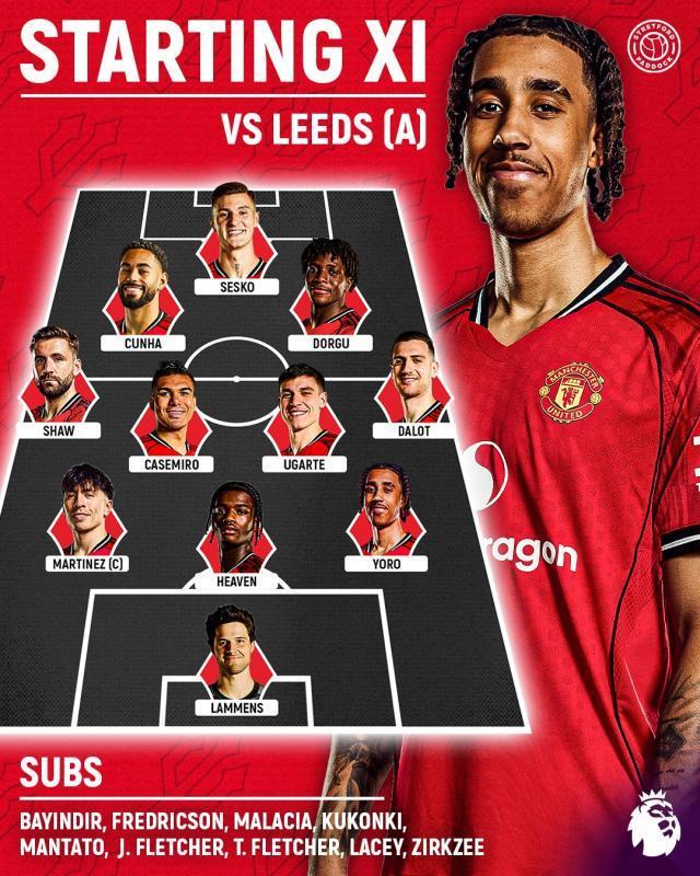曼联首发:拉门斯/约罗、希文、利桑德罗·马丁内斯/达洛特、乌加特、卡塞米罗、卢克·肖/多尔古、库尼亚/舍什科